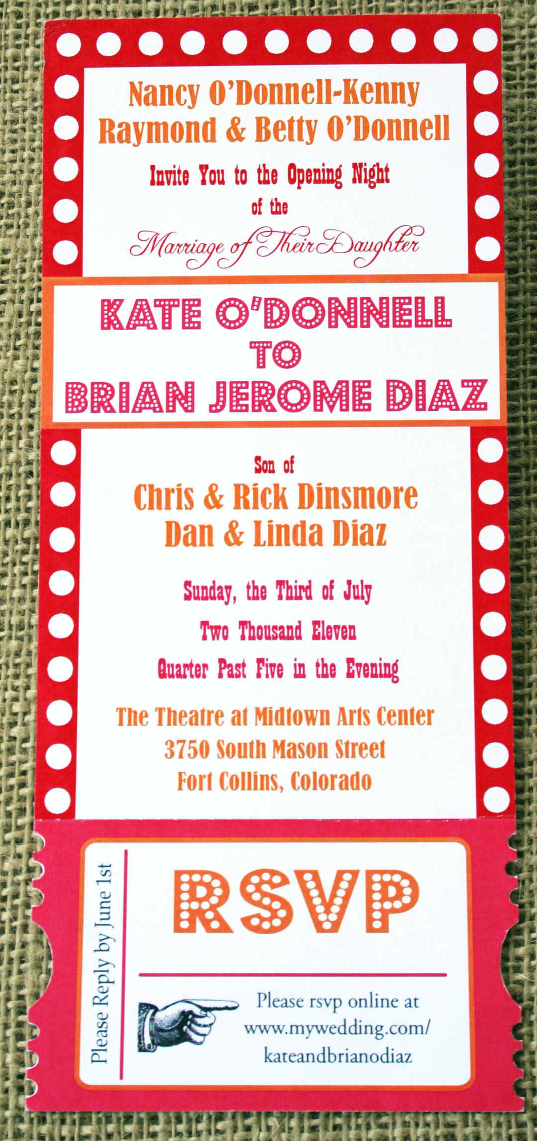 In the meantime, here is an invitation I designed for Kate O’Donnell Diaz. She and her husband, Brian, are theater lovers and wanted a theater themed invitation. They also wanted it to look like a ticket and have the RSVP card attached. Guests can tear off the RSVP card and save the invitation. Everyone was very happy with the results! Kate is a wedding planner and owner of Green Apple Weddings and Events: http://www.greenappleweddings.com/