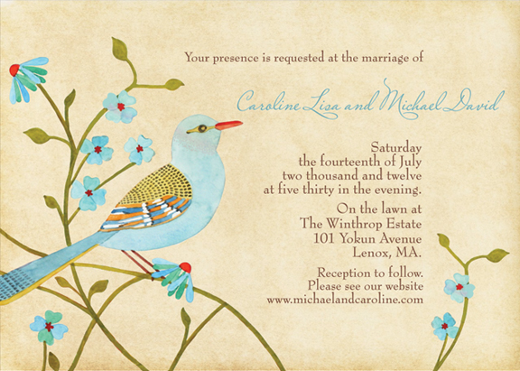 Happy Thursday everyone! It’s almost Friday, yay! In between my orders this week I have been working on a number of new designs. Here is one that I showed you before. This invitation features a watercolor bird and an aged background. I changed the format of the text and added a vine to the bottom to balance the composition.. Please check out the old version here. Do you like this one better?