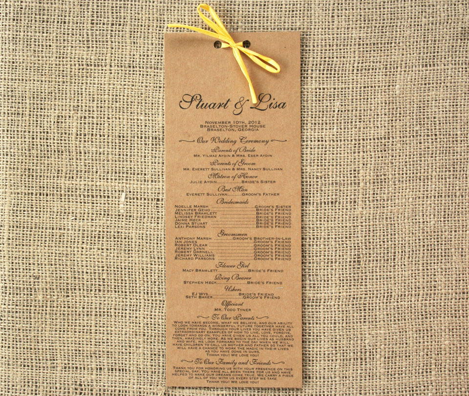 2 thoughts on “Rustic Kraft Paper Wedding Programs with yellow raffia