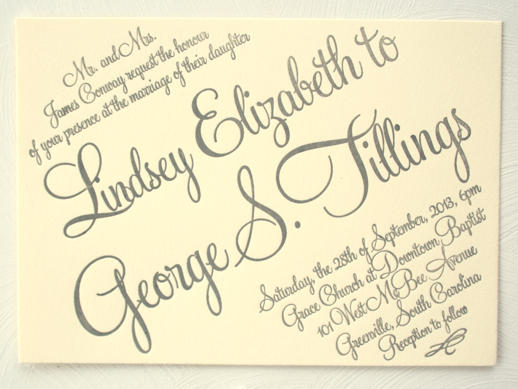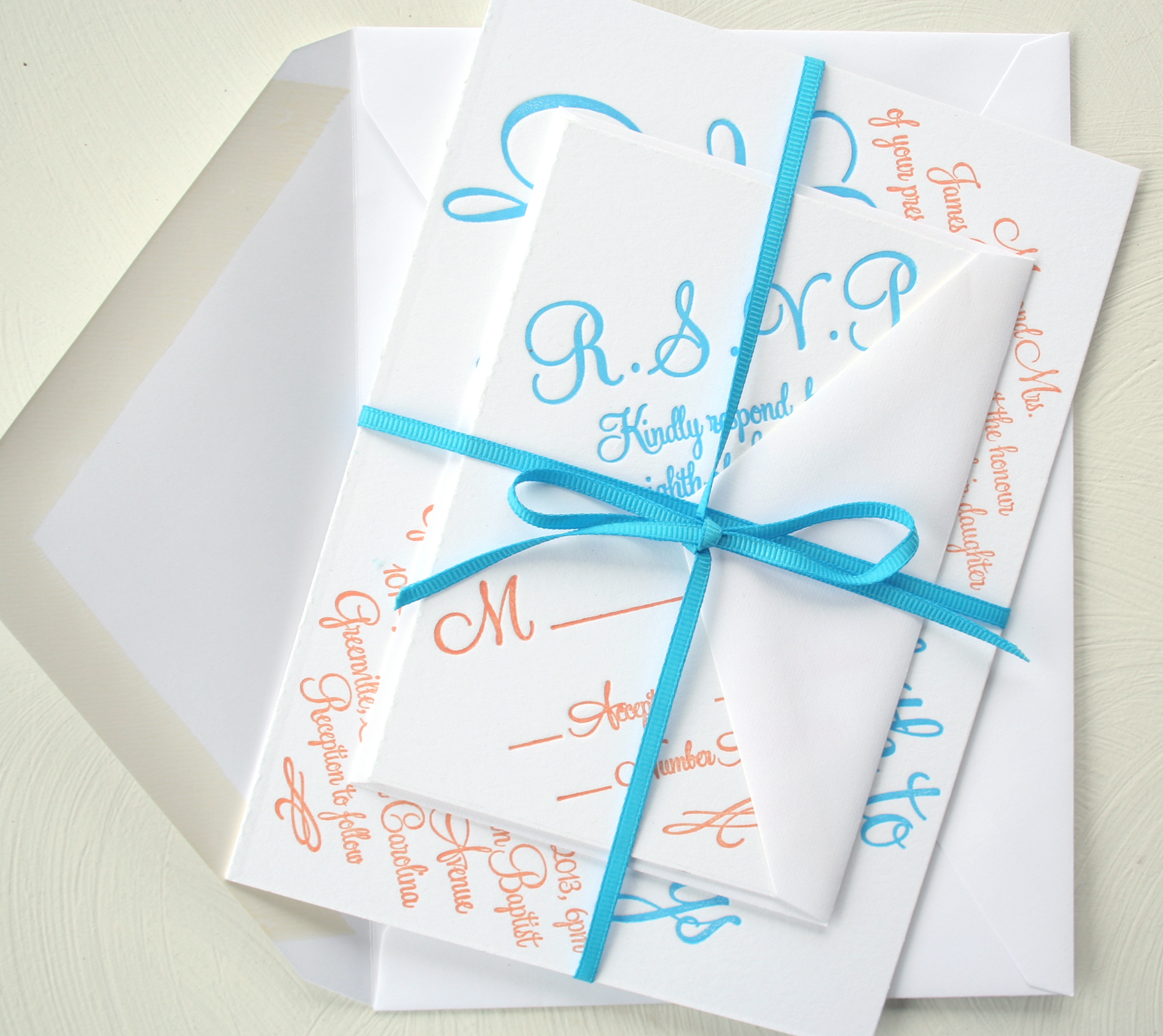 Over the next month I will be rolling out 4 or 5 new letterpress invitation designs. I am excited to show you the first! This letterpress invitation features a pretty modern script font. It can be printed in one or two colors, and the colors can be customized to match your wedding at no additional cost. This design looks great printed on white or cream stock. You can learn more about ordering this invitation suite for your wedding in the Sofia Invitations Etsy shop. Oh, and if you are on a tight budget….it is also available to be digitally printed!