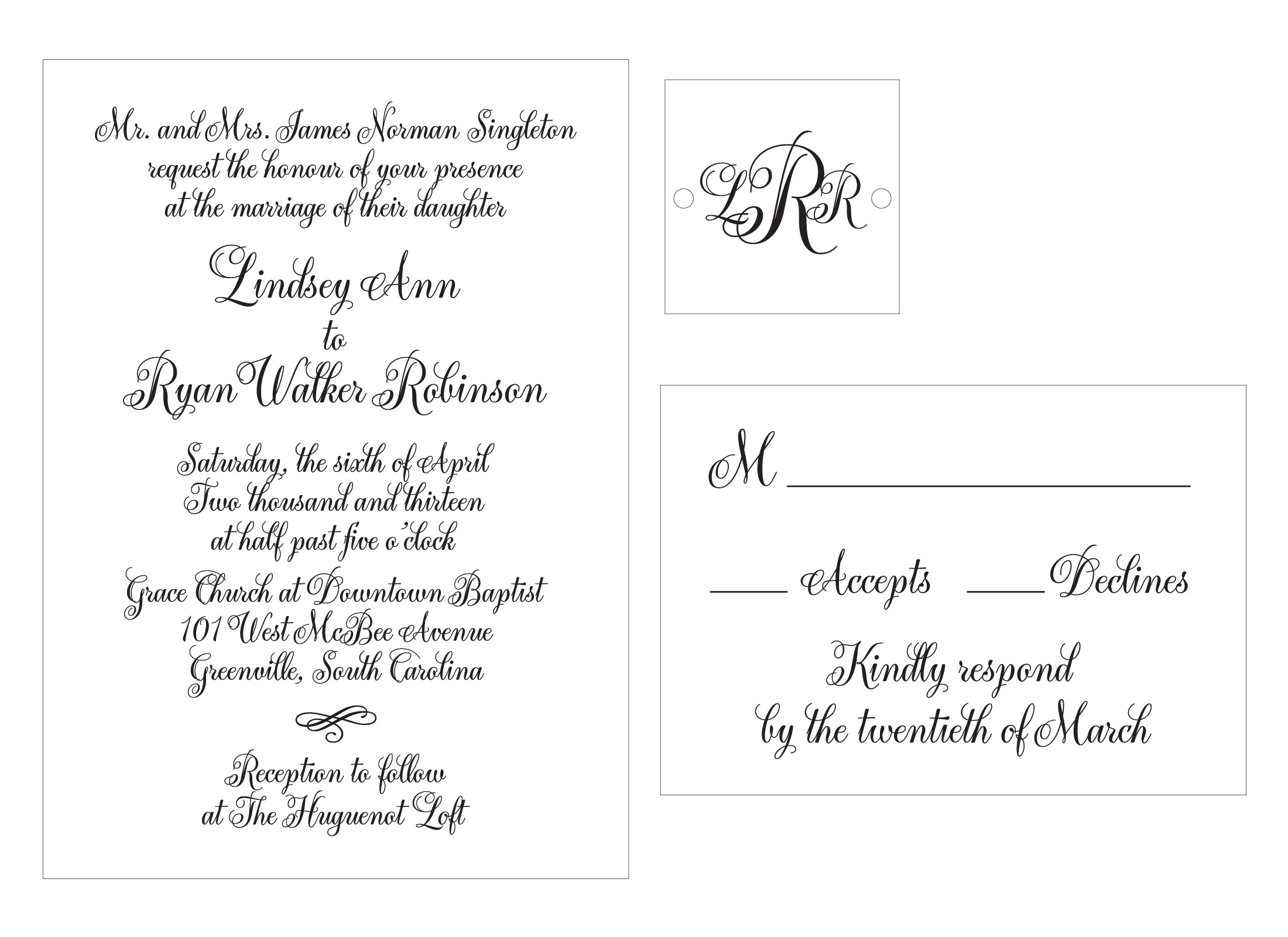 Here is a new wedding invitation I recently designed and printed as a custom order for a local customer in Greenville, South Carolina. This design features a beautiful calligraphy font, and is printed in simple and classic black on thick white 100% cotton papers. The lettering sinks into the paper beautifully. You can check out more details for ordering this invitation in my Sofia Invitations and Prints Etsy shop here.